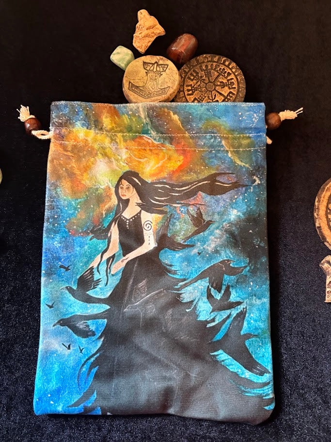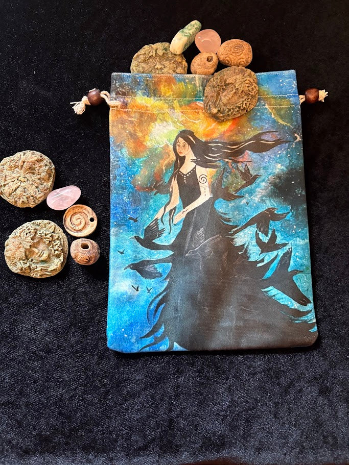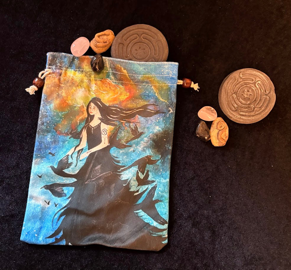 Beautiful Badba Velvet Bag, perfect for tarot or oracle cards, each one contains handmade stoneware Viking stones, Hekate stones or Green Man & Green Lady stones plus crystals. Each one will vary.
